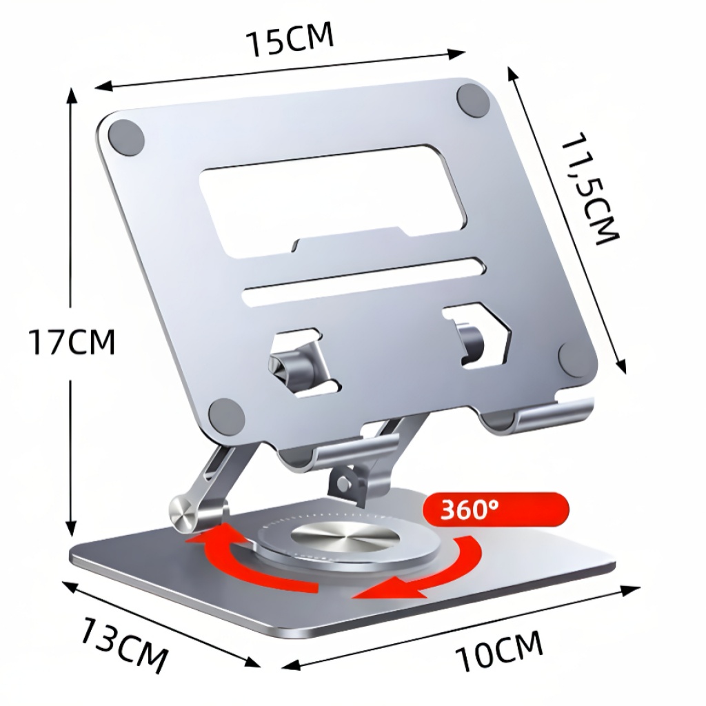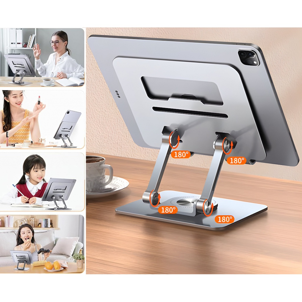 Soporte premium fabricado en aluminio de alta resistencia, ideal para cualquier modelo de tableta. Su diseño estable, con pliegues firmes y ajustables, permite usar la tablet en múltiples ángulos sin que se mueva. Además, cuenta con base giratoria 360°, perfecta para videollamadas, lectura, trabajo, cocina o presentaciones.