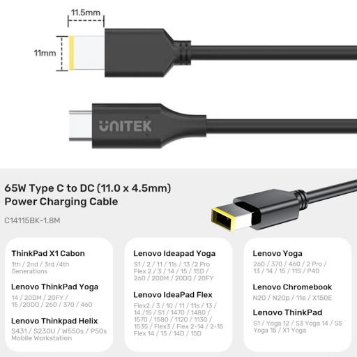 Longitud de 1,8 metros, es compatible con una amplia gama de Notebooks Lenovo y puede utilizarse con un cargador USB-C PD de más de 45W o un Power Bank PD