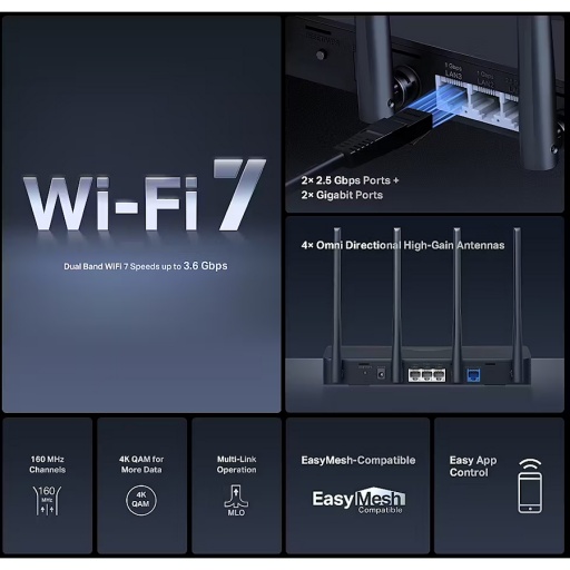Router con tecnología WiFi 7 que ofrece alta velocidad, baja latencia y excelente estabilidad para streaming, gaming y múltiples dispositivos conectados.