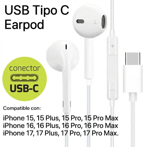 Auriculares con cable y conector USB-C, diseñados para brindar comodidad y excelente calidad de sonido en el uso diario. Compatibles con los modelos más recientes de iPhone y otros dispositivos con puerto USB-C.