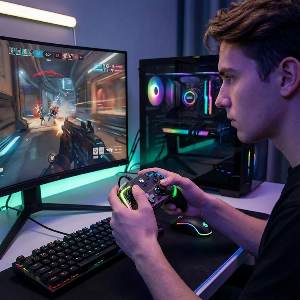Cuenta con un diseño transparente con iluminación RGB personalizable, sensores Hall Effect para máxima precisión y una respuesta ultra rápida ideal para juegos competitivos.