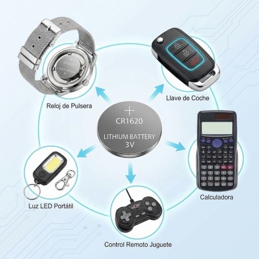 Pack de 5 pilas tipo botón CR1620 de 3V, ideales para dispositivos electrónicos de bajo consumo que requieren una fuente de energía confiable y duradera