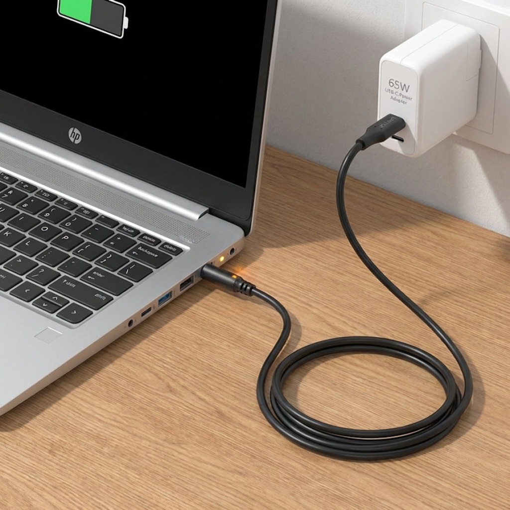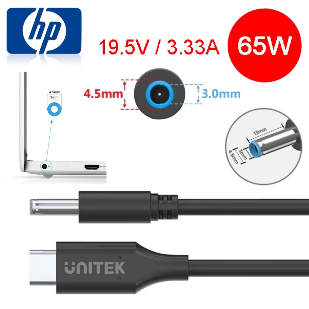 El cable de cargar laptops HP mediante una conexión USB-C a un conector DC redondo 4,5 x 3 mm